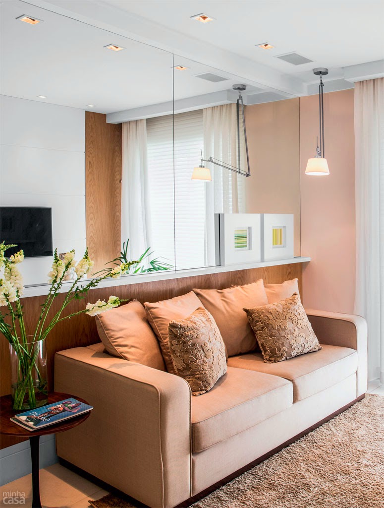 Lindona essa ideia do espelho... só fico pensando se esta prateleira atrás do sofá não incomoda quem está sentado, mas fica bonito... vou pensar como ficaria no meu apê! ;)